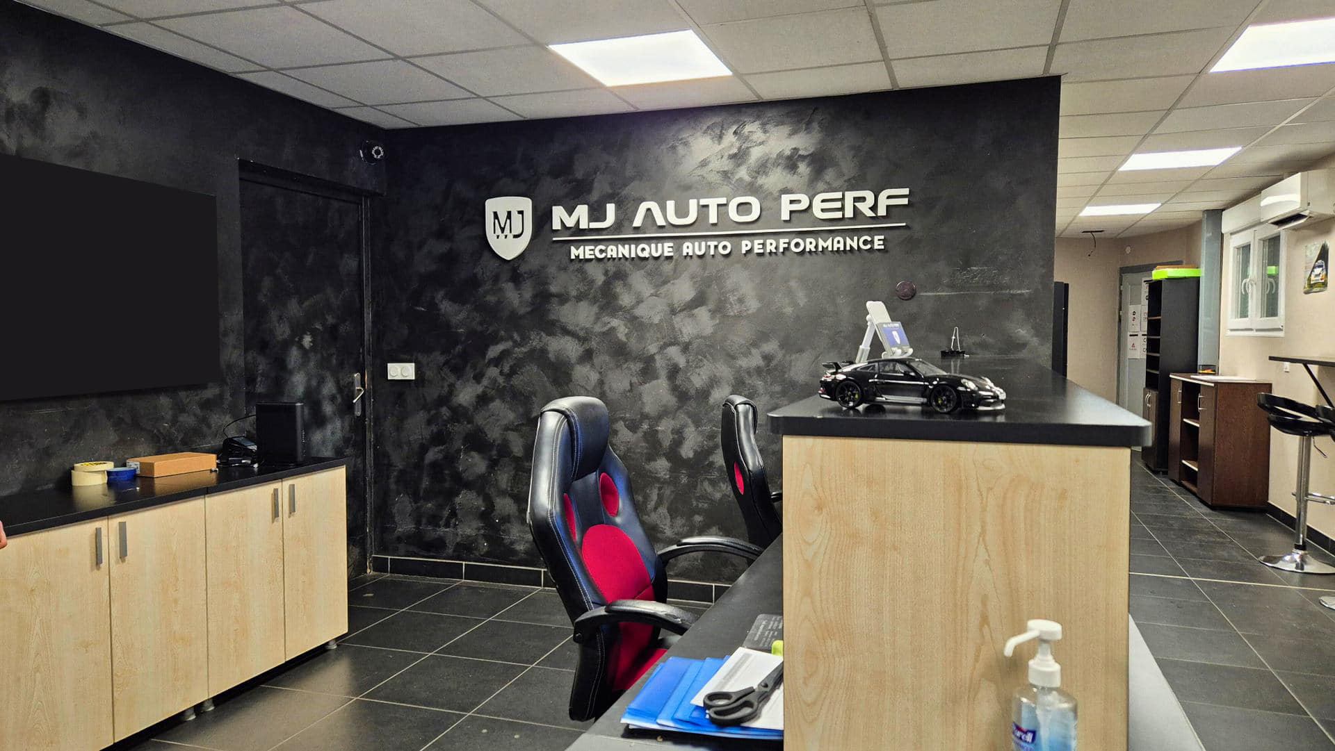 ✔Création du logo et de l’identité visuelle MJ Auto Perf : enseigne, cartes de visite, PLV.